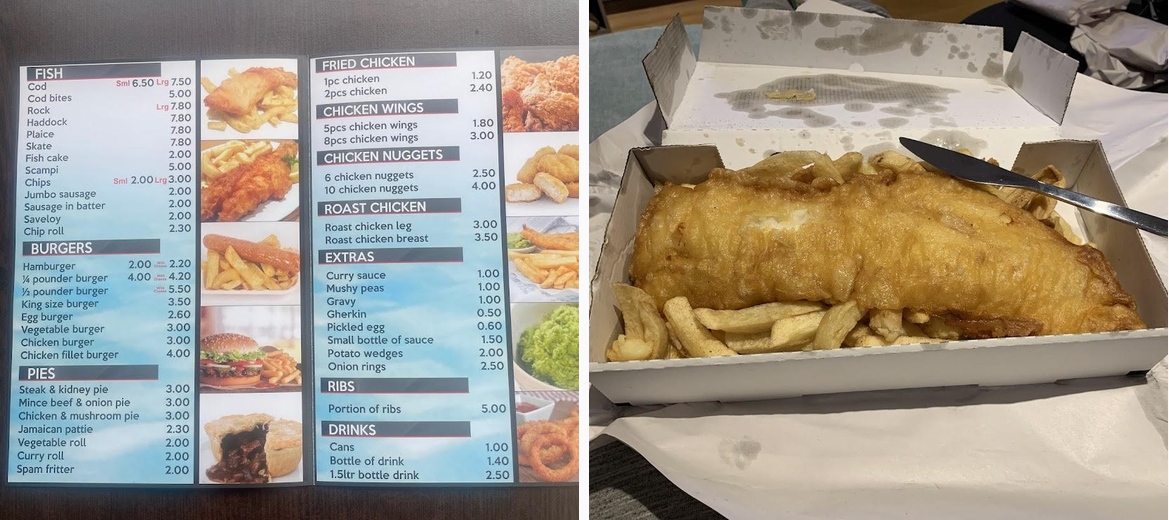 The food is always fresh, no matter what you order, I've just ordered fish and chips, and an egg burger. My mouth is drooling waiting😋and the staff are so nice, they get to know all their customers on a personal level. We love that, the best chip shop in Woolwich.